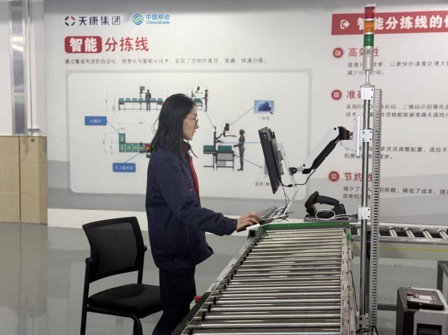 在天康集团智慧工厂,5G赋能货物的高效、准确、快速分拣。安徽移动供图